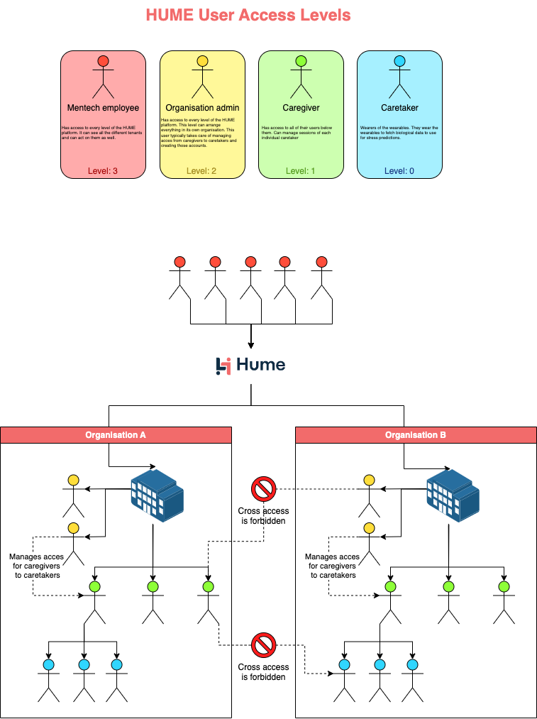 Mentech employee (Level 3): These are Mentech employees. They have the highest access rights and can view and manage virtually every layer of the HUME platform.